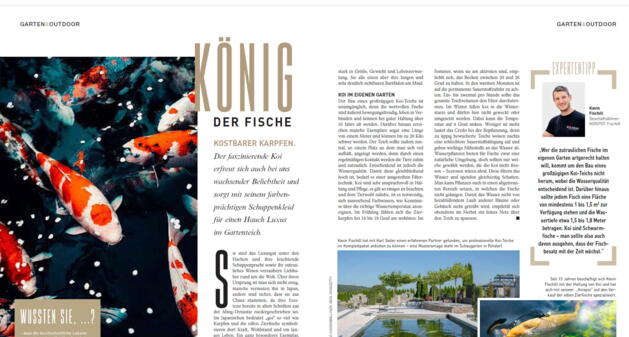 Viel Wissenswertes berichtet die aktuelle Ausgabe der Chefinfo LIVING auch über die prächtigen Koikarpfen und hat Kevin Fischill vom Koispot über die artgerechte Haltung befragt, für die er zusammen mit Karl Sailer ein Komplettangebot bietet.