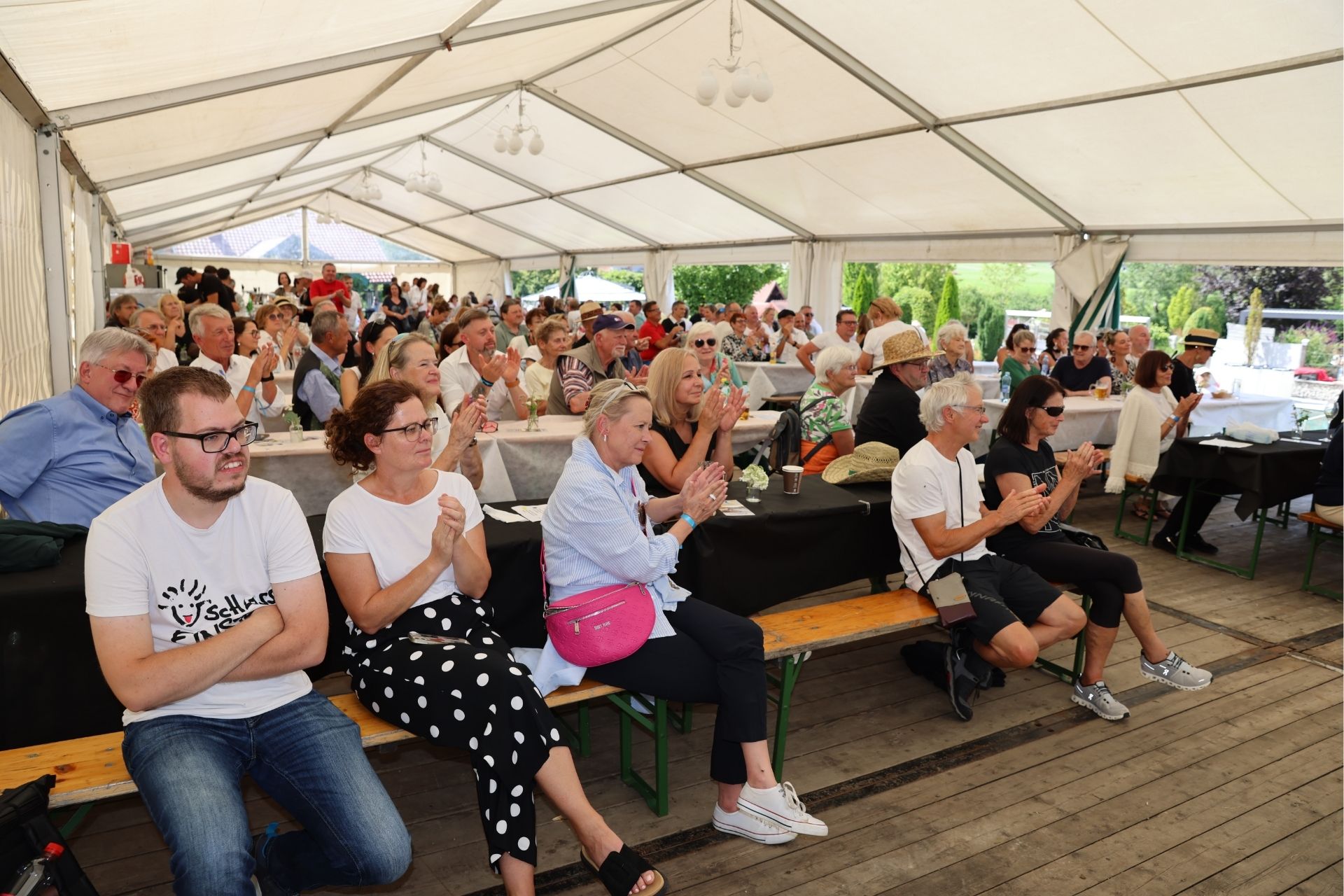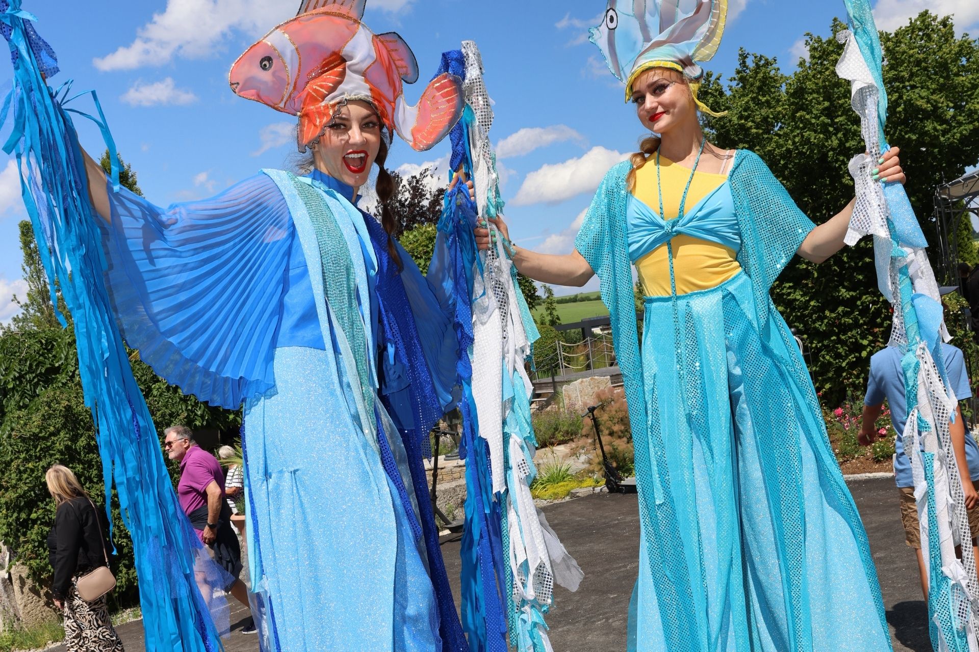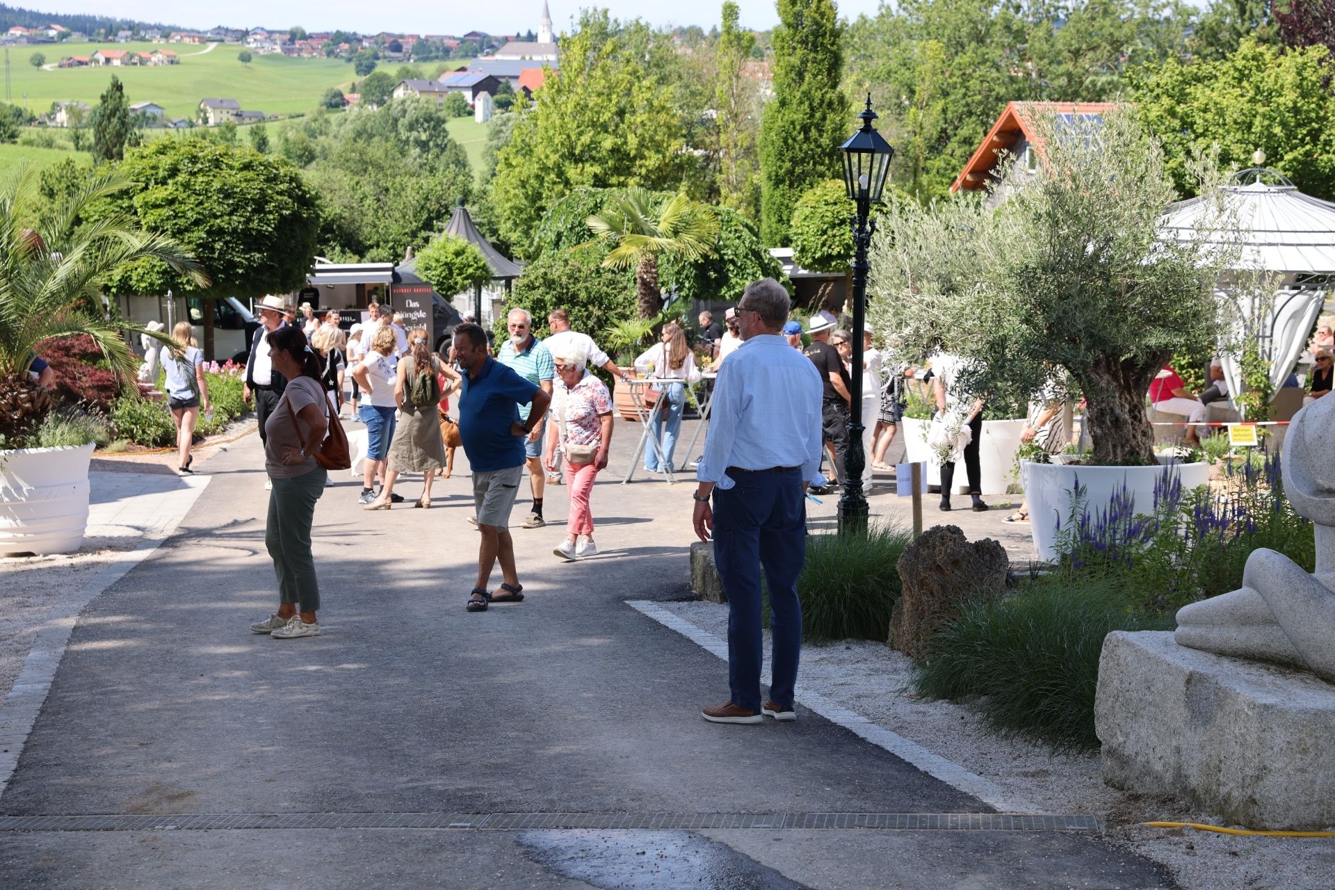 Ab 9 Uhr strömten Menschen aus Nah und Fern in den Schaugarten Pöndorf. Unter der Linde wurden die Gäste mit einem Sektempfang begrüßt. Viele nutzen den Jubiläumsrabatt, um im Garten-Center einzukaufen. Anschließend flanierte man gut gelaunt und bei schönem Wetter durch das weitläufige Gelände, begegnete Stelzengehern und ließ sich von Nebelmaschine und Seifenblasen verzaubern. Für Kinder gab es eigene Stationen wie Hüpfburg und Kinderschminken