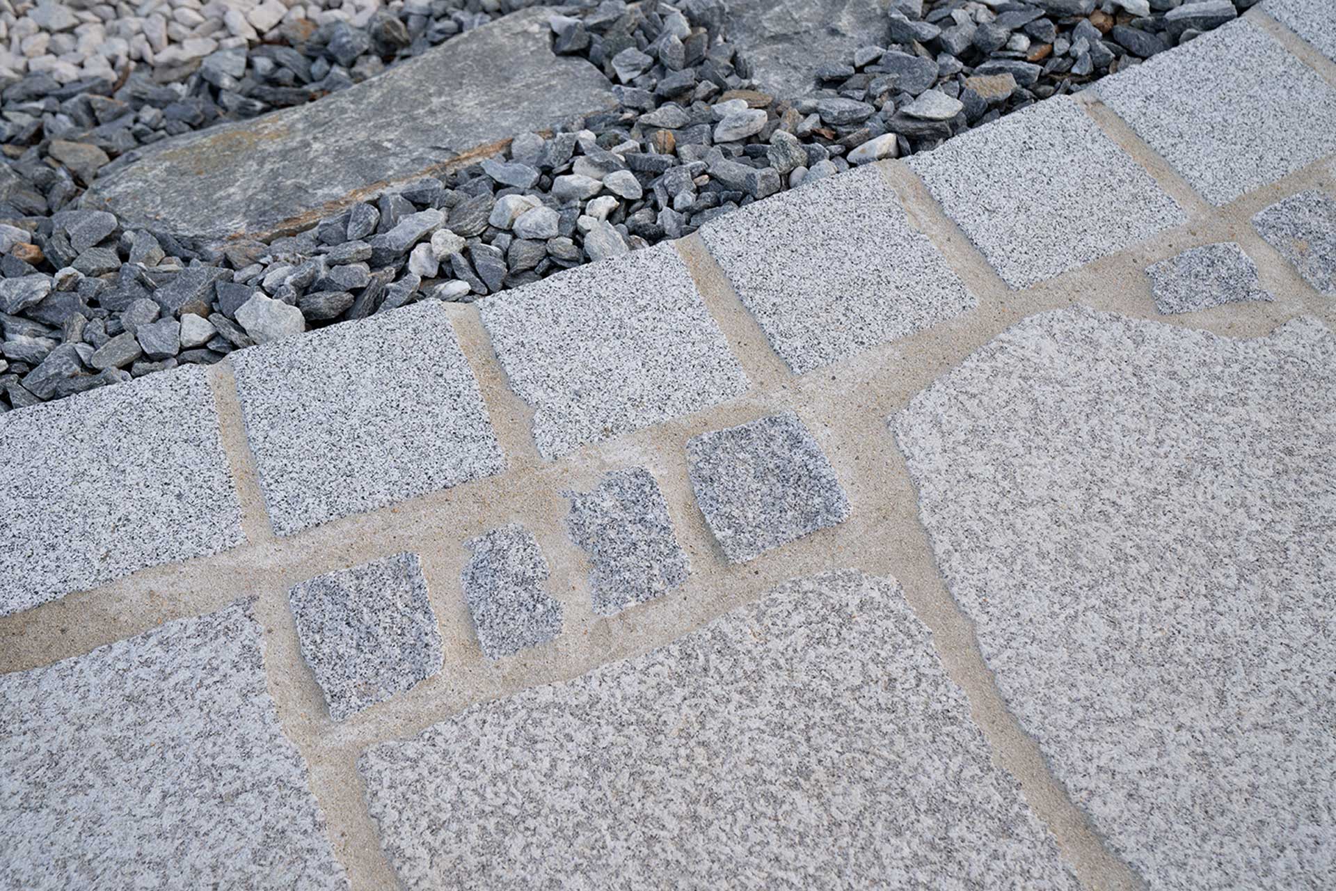 Wegebau mit Naturstein in verschiedenen Farben und Farben mit buntem Kies -