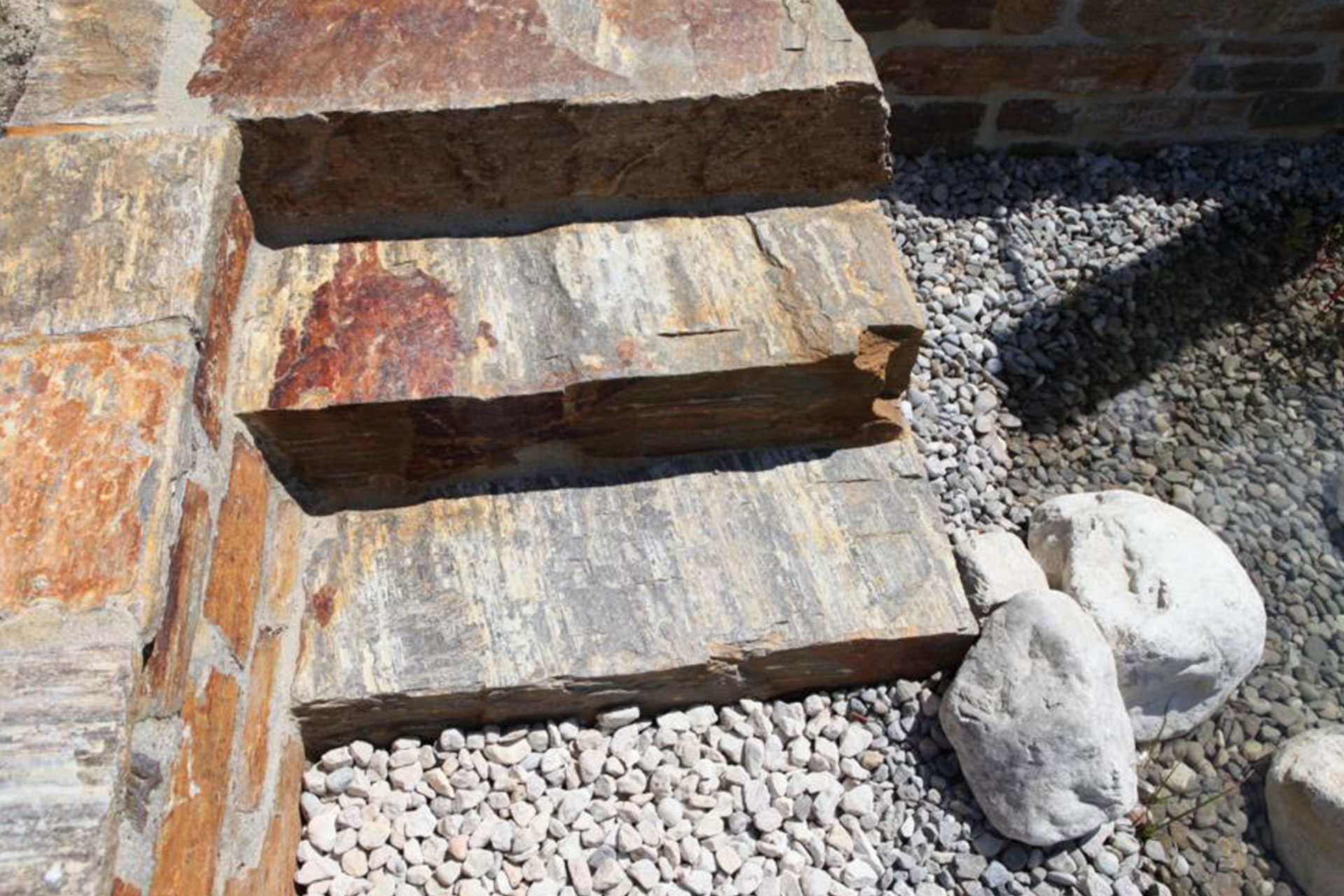 Mehrfarbiger Naturstein schafft reizvolle Ebenen im Garten -