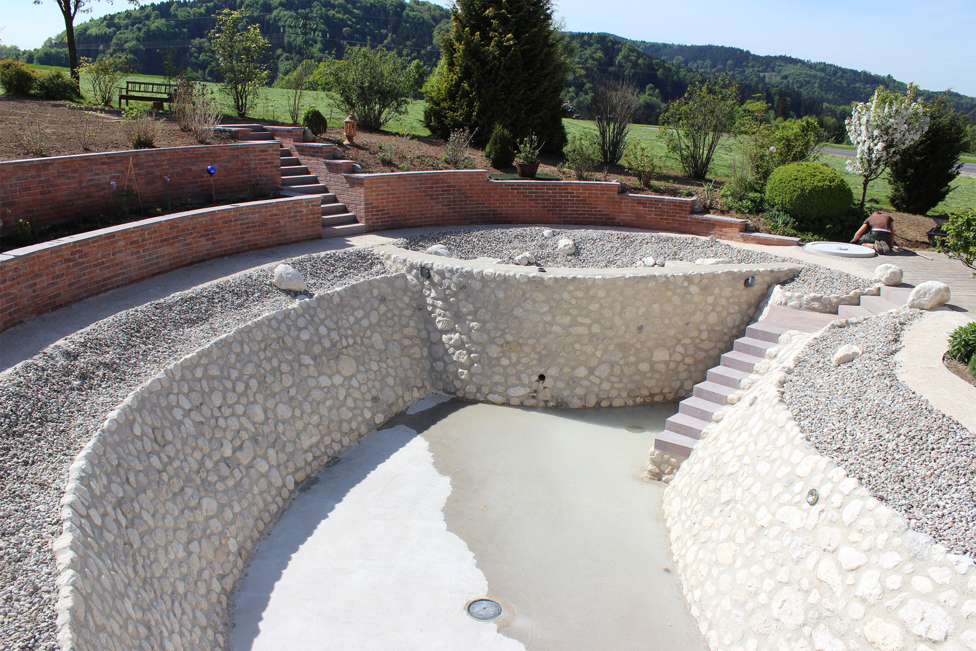 Naturpoolbau vom Fachmann: die Folie wird mit Natursteinen in Spezialbeton verkleidet -