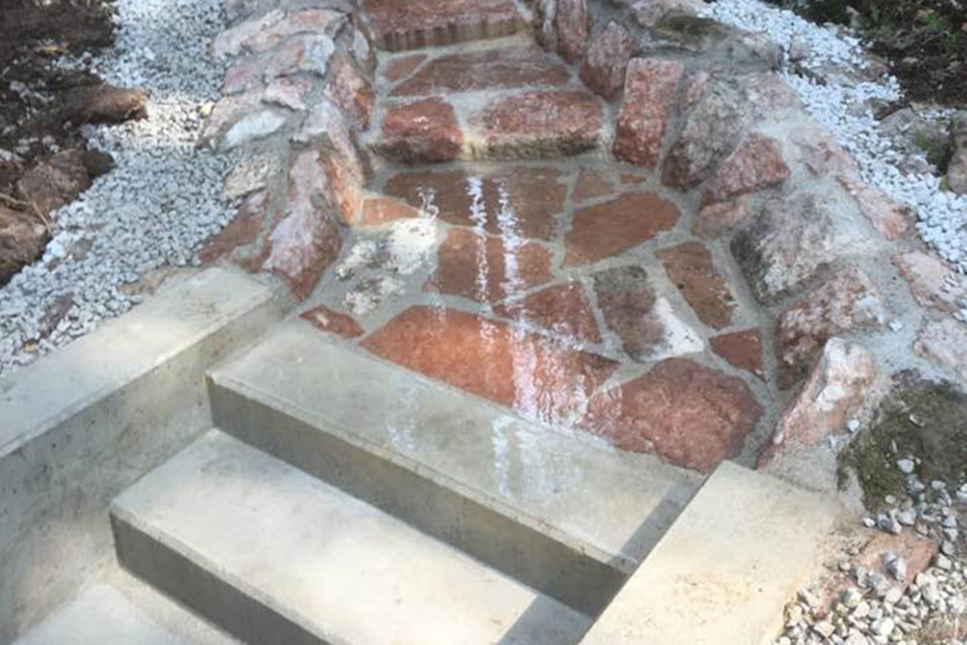 Pflasterung für Bachlauf mit rotem Naturstein vom Fachmann Karl Sailer OÖ Salzburg -