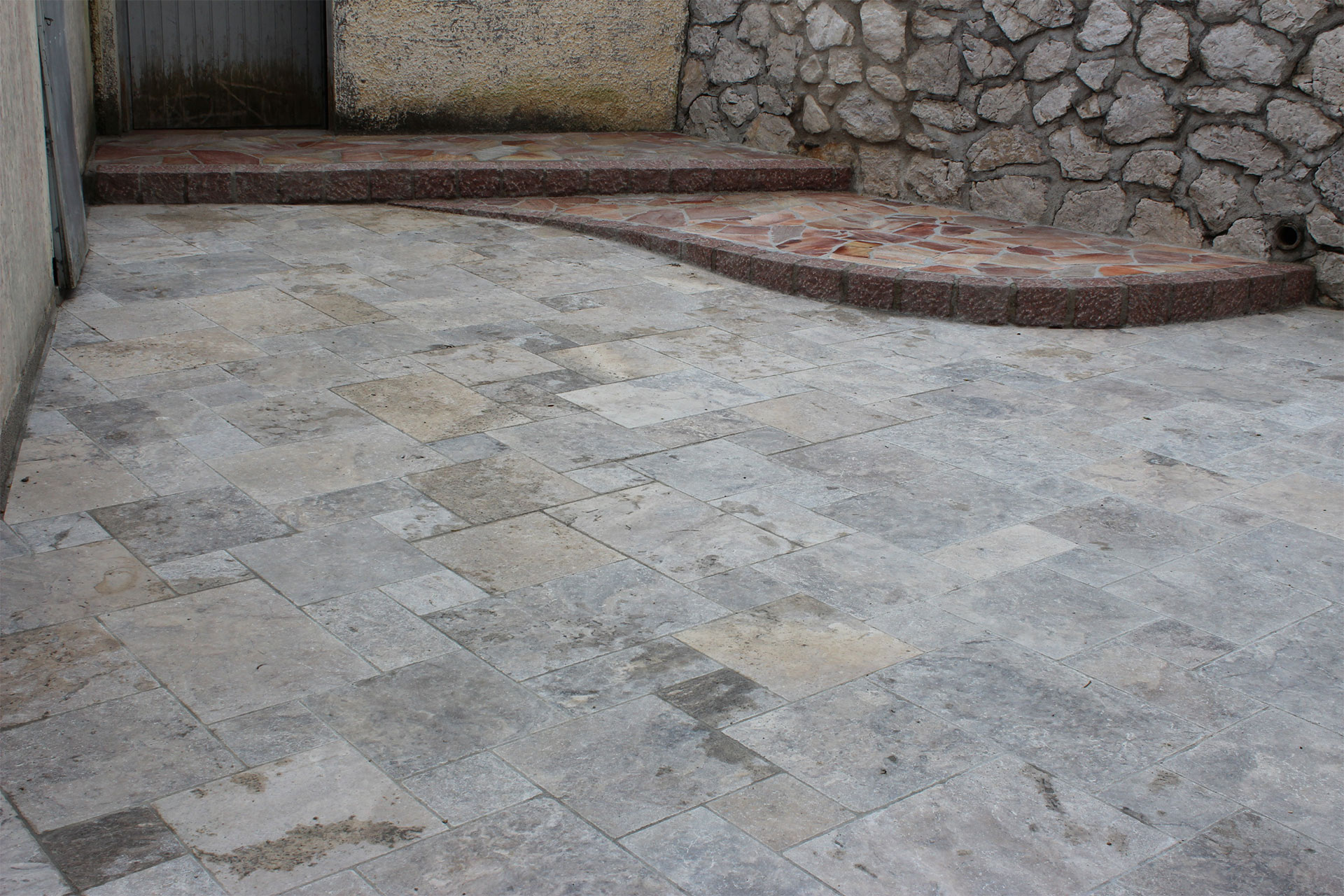 Naturstein für hochwertige Pflasterung mit Stufen und Steinmauer -