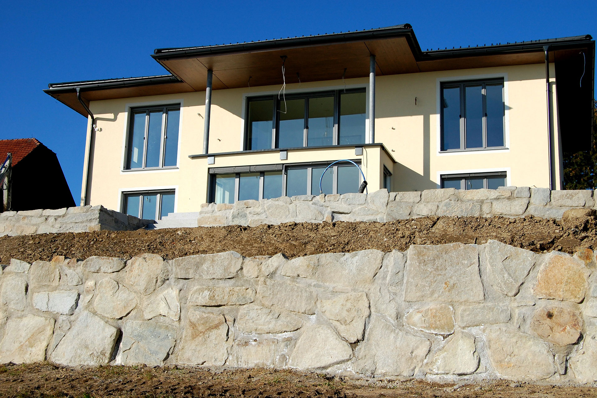 Rustikale Schwerlastmauer stützt den Hang eines modernen Neubaus -